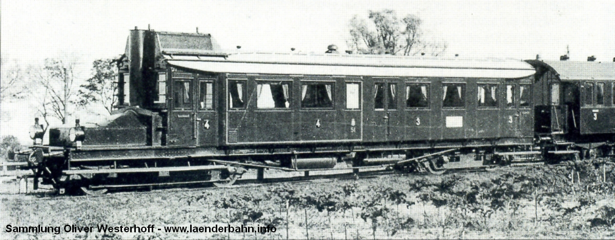 Benzolelektrischer Triebwagen der G.O.E., beschafft 1910 (oder 1911) von der Firma Düsseldorfer Eisenbahnbedarf. Dies ist eines der wenigen Bilder des Triebwagens, vermutlich um 1913 aufgenommen.