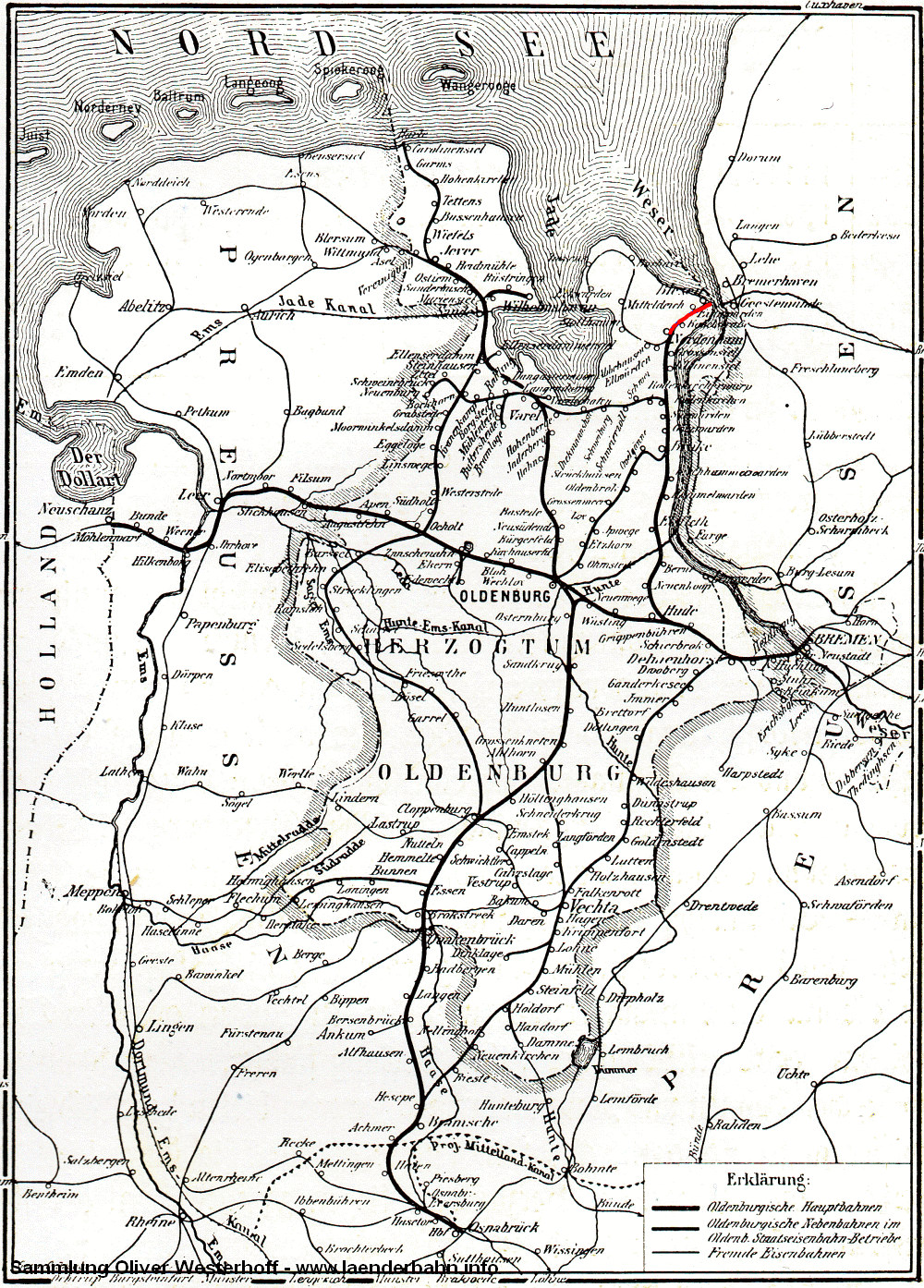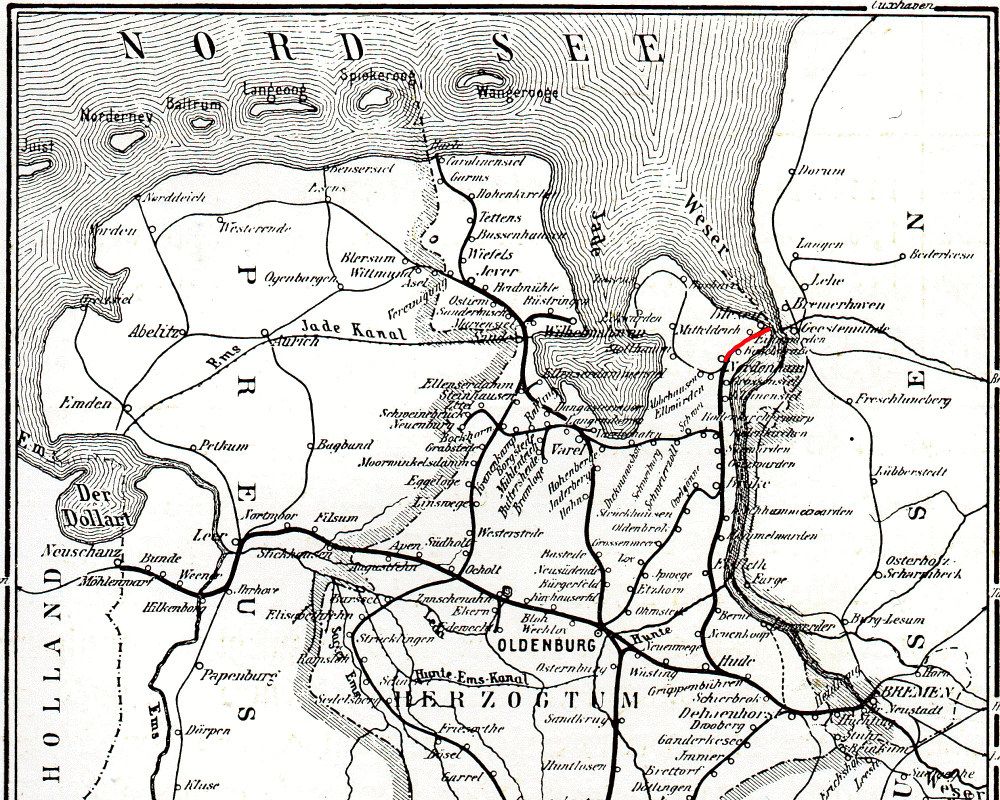 Rot markiert die Bahnlinie von Nordenham nach Blexen